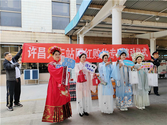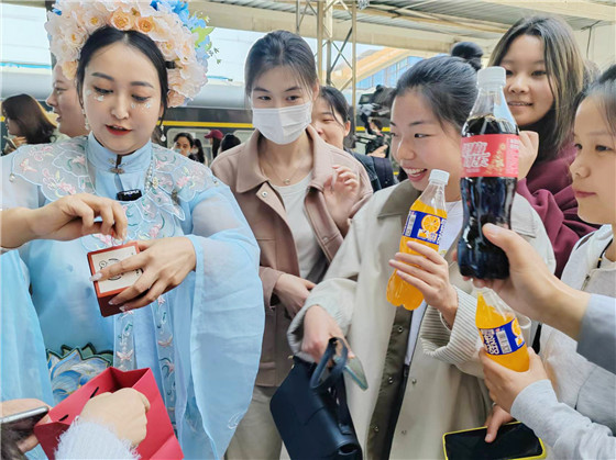 當(dāng)天上午,許昌市文旅局組織人員為乘坐首趟網(wǎng)紅購物旅游專列到達(dá)許昌的游客送上禮品和許昌特產(chǎn)。
