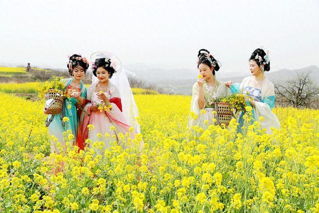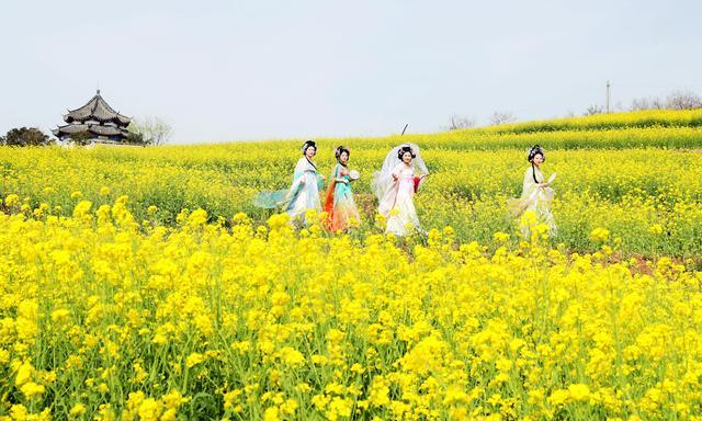 3月30日,四位穿漢服的少女在禹州市方山鎮(zhèn)押莊村千畝油菜園打卡拍照。陽(yáng)春三月,春意盎然,押莊村千畝油菜園內(nèi),油菜花競(jìng)相怒放,一層層、一片片,密密匝匝,漫山遍野,蔚為壯觀。游客徜徉花海,沐浴春光,流連忘返。