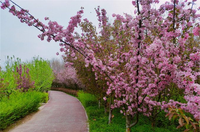 鄭州樹木園有木瓜海棠、日本海棠、貼梗海棠、西府海棠、紅寶石等多個品種,主要分布在園內(nèi)林海大道兩側(cè)和花博園的海棠園。