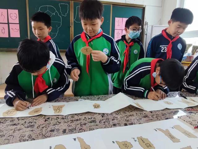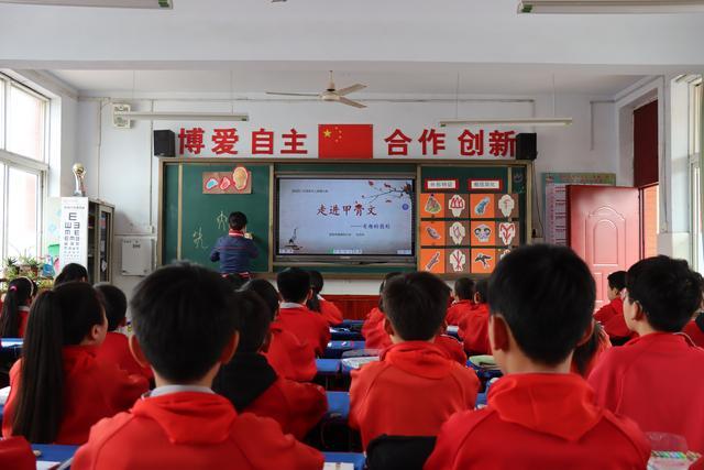 “學(xué)校已經(jīng)構(gòu)建了以語(yǔ)文教學(xué)為主,與藝術(shù)課、綜合實(shí)踐課相融合的甲骨文課程體系,有識(shí)讀課、書(shū)法課、故事課、文化課,最大限度地提升學(xué)生學(xué)習(xí)甲骨文的興趣。”安陽(yáng)市鐵佛寺小學(xué)黨支部書(shū)記劉艷麗介紹,自從2020年“甲骨文進(jìn)校園”,如今無(wú)論是教學(xué)樓走廊、門洞口,還是綠化帶、體育場(chǎng),無(wú)論是在課堂還是課間游戲中,甲骨文元素?zé)o處不在。