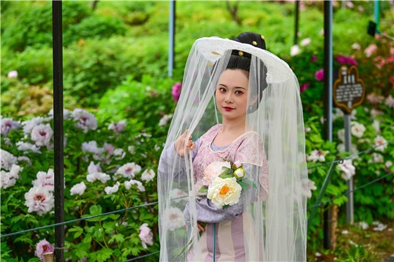 在隋唐城遺址植物園,身著漢服的游客體驗沉浸式賞花。李衛(wèi)超 攝