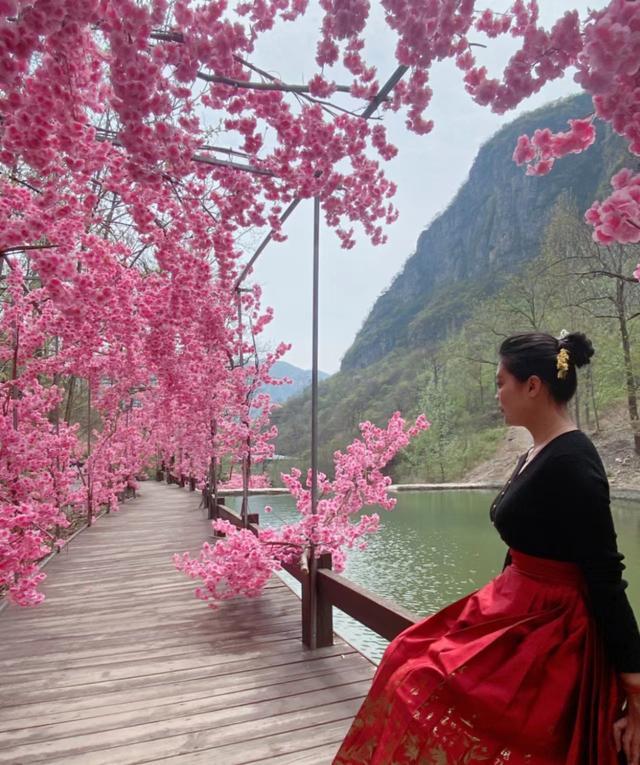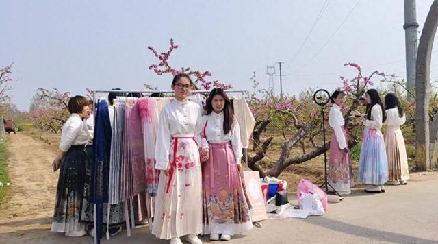 “衛(wèi)輝的萬畝桃花實在太美了,我也慕名而來。正好看見有馬面裙直播,非常漂亮,回頭我想給女朋友買一套。”來自山西的游客董亞東說。來自新鄉(xiāng)市區(qū)的賈雪茹和小姐妹們到桃花源拍照打卡,忍不住試穿了一套桃花漢服。她高興地說:“你看我們試穿的這條桃花馬面裙和周圍的桃花相映襯,尤其是衣服袖口,映襯著一些桃花刺繡,顯得格外漂亮。今天的打卡體驗太棒了!”