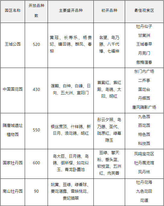 全園共有約600個(gè)品種牡丹開放,開花牡丹約占本園牡丹的58%,主要分布在南園鳳鳴寶花區(qū)、精品園、牡丹展覽館、鳳丹林、北園九色臺(tái)、廣場兩側(cè)、江南、西北牡丹收集區(qū)等處。其中:盛開的牡丹品種有島大臣、日月錦、島錦、御所櫻、如花似玉、青龍臥墨池等;初開的牡丹品種有豆綠、擎天粉、垂頭藍(lán)、軟枝藍(lán)、五洲紅、肉芙蓉等。園內(nèi)紫藤、海棠、丁香、棣棠、杜鵑、碧桃、櫻花、紫荊等爭奇斗艷。