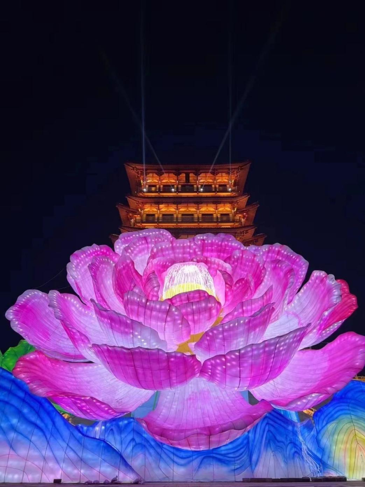 在洛陽牡丹文化節(jié)期間,白天去看國色天香的牡丹,晚上可以到牡丹閣景區(qū)觀賞創(chuàng)造吉尼斯世界紀錄的最大立式花燈——《牡丹燈皇》,也可以到應天門北廣場觀看3D燈光投影秀。