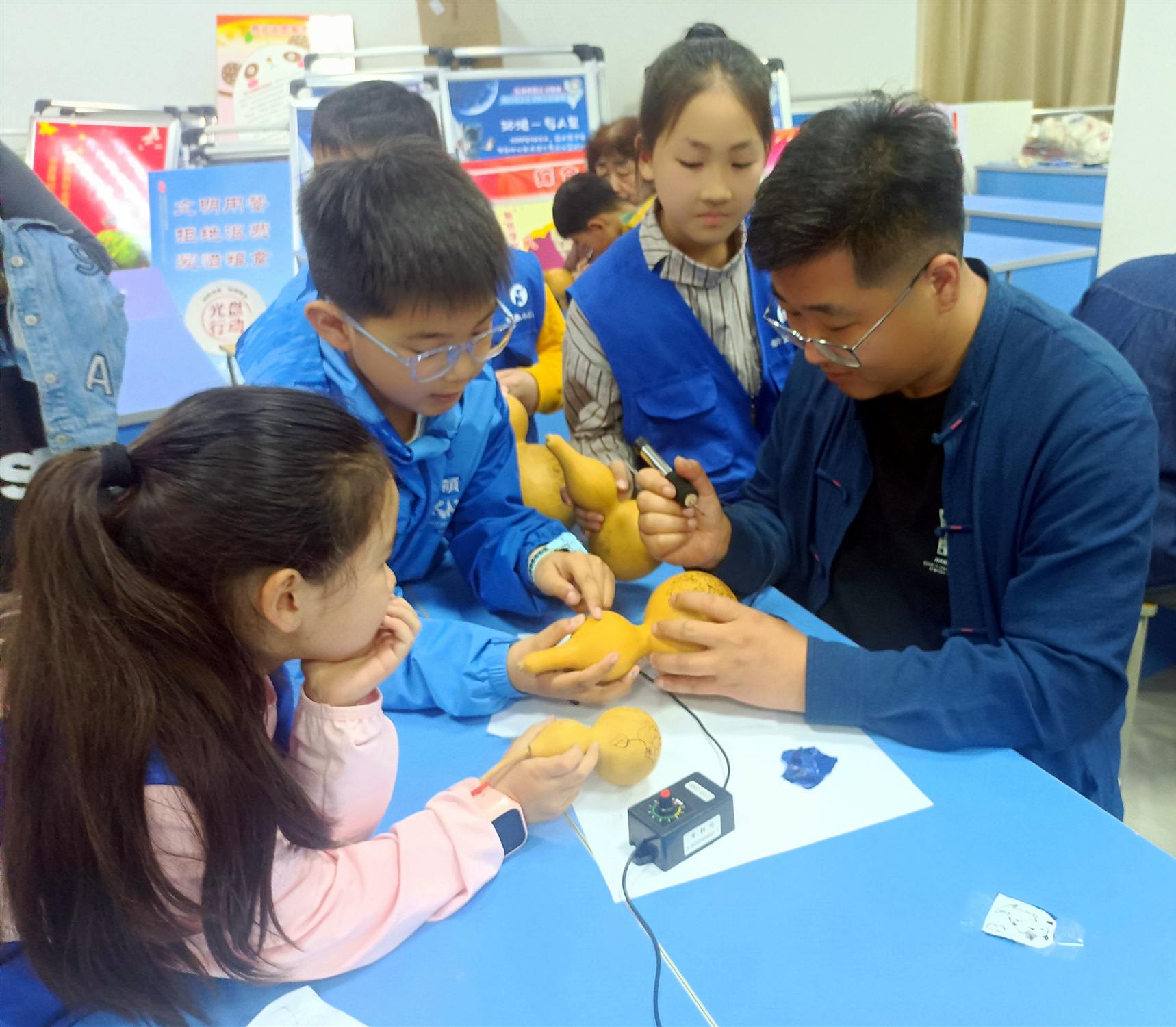 陳浩云(右一)給孩子們講解烙畫(huà)的制作流程 琚銘潔 攝