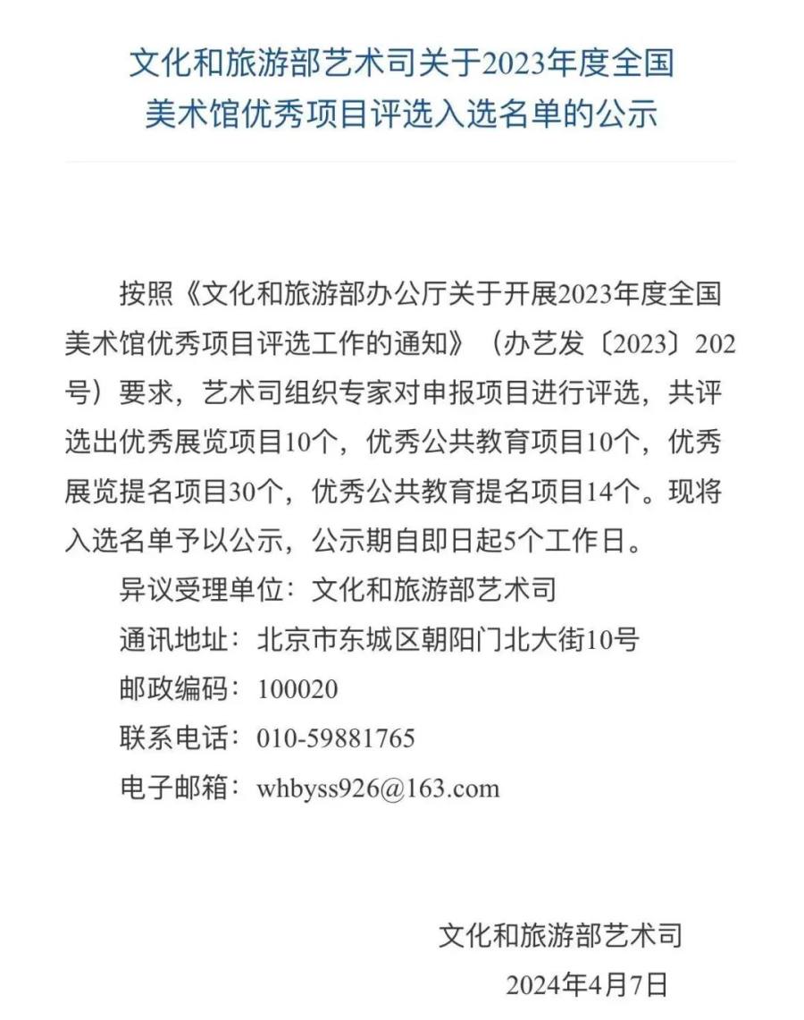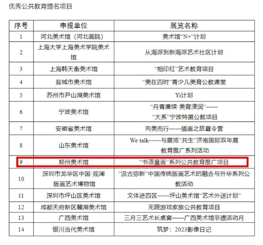 近日,文化和旅游部藝術(shù)司公布了2023年度全國(guó)美術(shù)館優(yōu)秀項(xiàng)目入選名單,評(píng)選出優(yōu)秀展覽項(xiàng)目10個(gè),優(yōu)秀展覽提名項(xiàng)目30個(gè),優(yōu)秀公共教育項(xiàng)目10個(gè),優(yōu)秀公共教育提名項(xiàng)目14個(gè)。其中,鄭州美術(shù)館的品牌項(xiàng)目《“書語(yǔ)童畫”系列公共教育推廣項(xiàng)目》獲得“2023年度全國(guó)美術(shù)館優(yōu)秀公共教育提名項(xiàng)目”榮譽(yù)。全國(guó)美術(shù)館優(yōu)秀項(xiàng)目評(píng)選為美術(shù)館屆最高獎(jiǎng),2023年度“書語(yǔ)童畫”系列公共教育推廣項(xiàng)目是鄭州美術(shù)館公共教育項(xiàng)目第三次榮獲此殊榮。