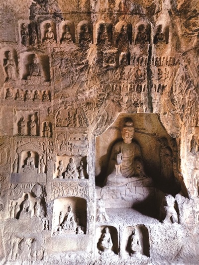龍門崖壁洞窟內(nèi)的精美浮雕 (洛陽(yáng)晚報(bào)資料圖片)