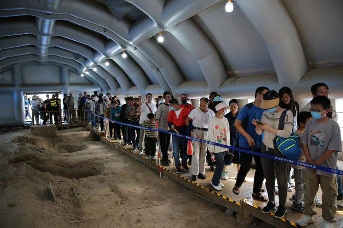 因考古工地場地有限,達到日承載量后將不再接受預(yù)約。超出遺址承載量時,工作人員將根據(jù)實際情況及時對遺址內(nèi)參觀人員進行分流疏導(dǎo)。