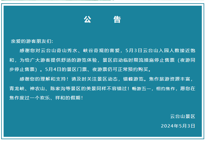 云臺山景區(qū)發(fā)布限流公告