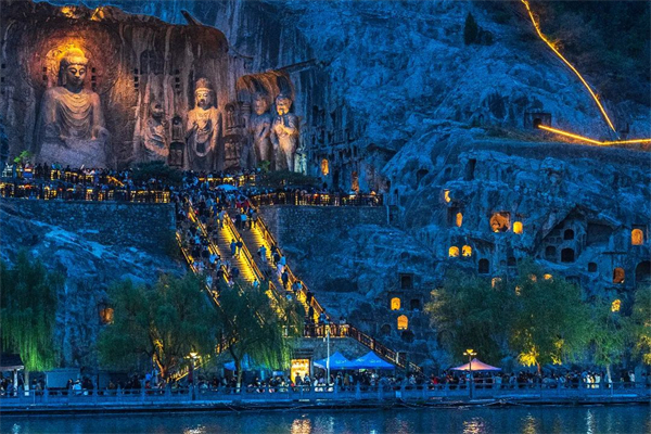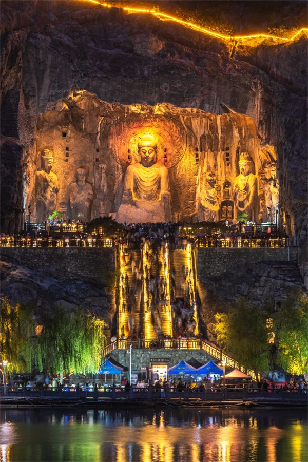 在燈光的烘托下,龍門石窟景區(qū)的洞窟造像顯得尤為莊嚴(yán)神圣,當(dāng)您“云游”這氛圍之中,更能品味石刻藝術(shù)的魅力、感悟中國歷史文化的厚重。