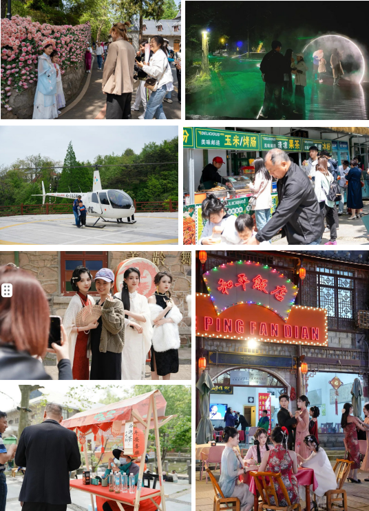 豐富產(chǎn)品帶來花式玩法:在充滿民國風(fēng)情的美齡舞廳,景區(qū)全新推出了妝造體驗館,各式各樣的旗袍、漢服、簪花吸引了大批游客換裝體驗。同時景區(qū)還升級推出了燈光秀夜游、民國風(fēng)情街、直升機(jī)低空游、山間咖啡館、特色冷泡茶、小吃美食等各類產(chǎn)品業(yè)態(tài),豐富的產(chǎn)品體驗備受游客喜愛與好評。