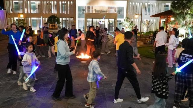 夜幕降臨,東岳村樸宿微瀾民宿院內(nèi)熱鬧非凡,游客訂制的特色燒烤宴拉開序幕,近百名來自鄭州的自駕游游客在院內(nèi)一邊品嘗光山美食,一邊觀看大屏幕上投放的電影,餐后還辦起了篝火晚會(huì),大家歡聲笑語、載歌載舞享受在這里的休閑時(shí)光……