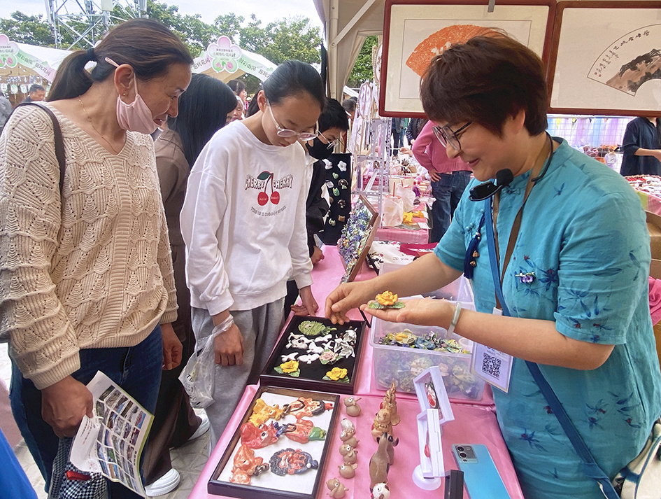 蔡永閣(右一)向游客展示文創(chuàng)作品 李萍 攝