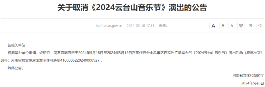 5月10日,河南省文化和旅游廳發(fā)布公告,根據(jù)舉辦單位申請,經(jīng)研究,同意取消原定于2024年5月18日至2024年5月19日在焦作云臺山風景區(qū)百家?guī)r廣場舉辦的《2024云臺山音樂節(jié)》演出活動。
