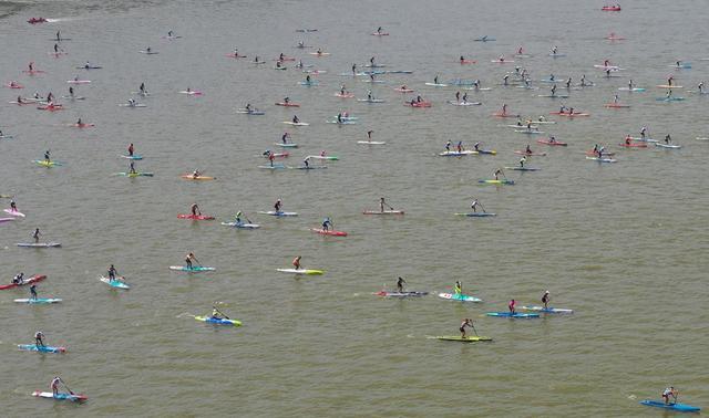 當天上午9時30分許,在一陣汽笛的長鳴聲中,參加6000米長距離比賽的百余名運動員們揮槳破水,迅速沖出起點。剎那間,波光粼粼的水面上,五顏六色的槳板在水面上你追我趕、奮力滑行,一場精彩絕倫的比賽正式開始。水上,運動員們或站姿或跪姿,手中的槳板忽左忽右,不一會就消失在河面遠處;岸邊,大家或用望遠鏡觀看,或吶喊助威,“加油!”“加油!”的呼喊聲音不絕于耳。