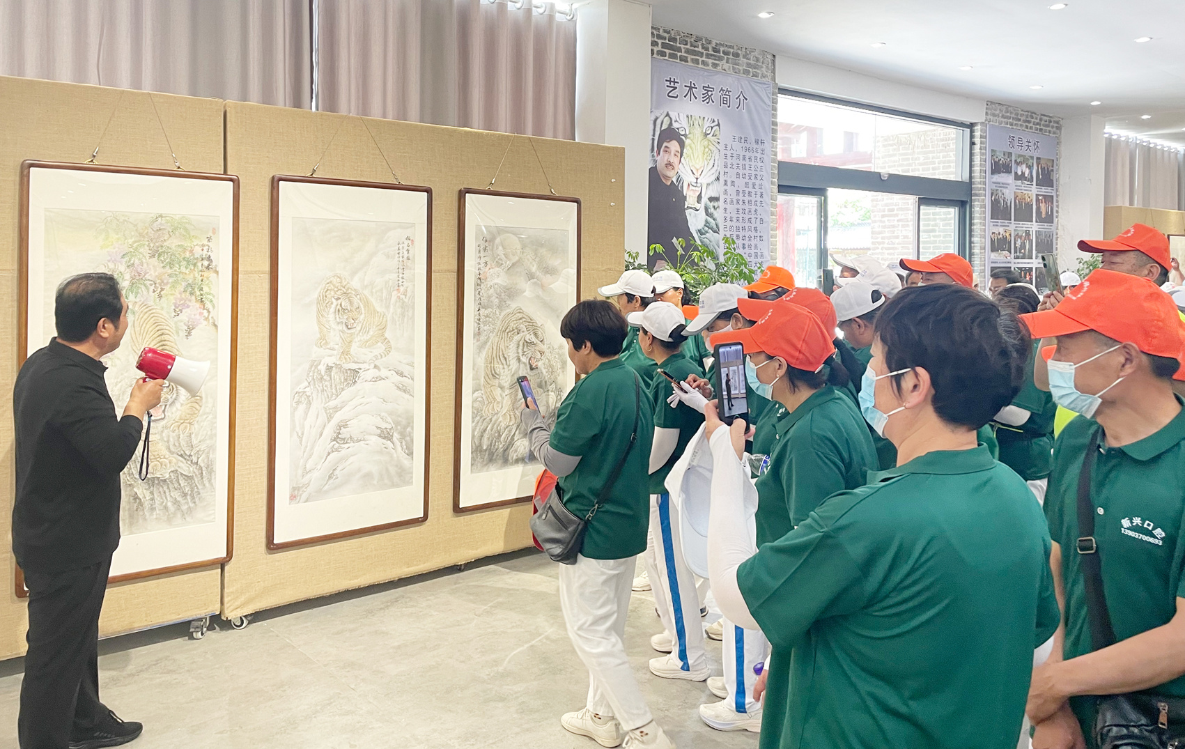 在虎棧創(chuàng)客中心,游客們看著小到三尺虎首圖、大到丈二的五福圖,贊嘆不已。“一直聽說王公莊村素有‘中國畫虎第一村’的稱號,今天來了一看,確實名不虛傳。”來自開封的游客李峰指著正在展出的畫作說,“每幅畫都栩栩如生,農(nóng)民畫家能畫成這樣實在是令人驚嘆!”