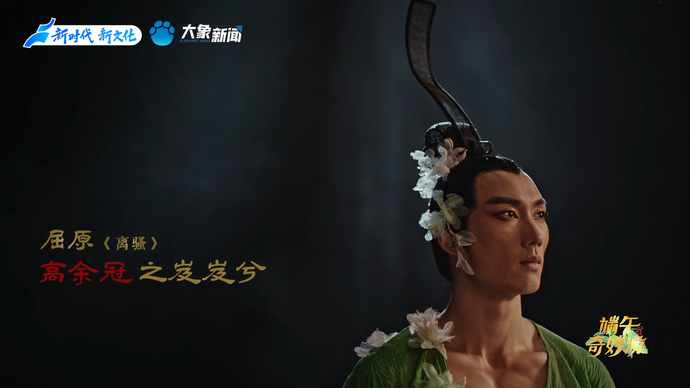 相傳先秦時期楚國三閭大夫、愛國詩人屈原遭讒不用,于農(nóng)歷五月五日投汨羅江。后世很多地方的端午節(jié),都有紀(jì)念屈原的習(xí)俗。在舞蹈《屈子問天》中,舞者大朱飾演的屈原,在蝴蝶環(huán)繞中以舞撫琴,與冰冷的現(xiàn)實、與自己筆下的“眾神”對話,最后攜琴飛升,在另一個世界感知到了國人對他從不間斷的紀(jì)念。這是著名舞蹈藝術(shù)家楊麗萍擔(dān)任總導(dǎo)演、著名音樂家譚盾親任音樂總監(jiān)的原創(chuàng)史詩舞臺劇《荊楚映象》中的舞段,整部作品尚未首演,河南衛(wèi)視先將其搬上了電視舞臺,并進(jìn)行了影視化的浪漫演繹!峨x騷》云:“制芰荷以為衣兮,集芙蓉以為裳。不吾知其亦已兮,茍余情其信芳。”舞段名為問天,更是與內(nèi)心的對話。心有芳菲,終得回響。