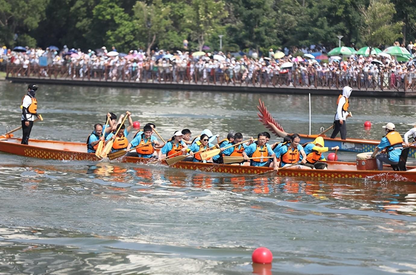 伴隨著開賽汽笛鳴響,平靜的賈魯河水面瞬間鼓聲震天、浪花翻飛,參賽選手們在舵手的指揮下奮力劃動船槳,向著終點發(fā)起沖鋒。盡管天氣炎熱,但是賈魯河兩岸依然匯聚了2萬余名觀眾,大家伴著鼓點聲為選手加油助威。