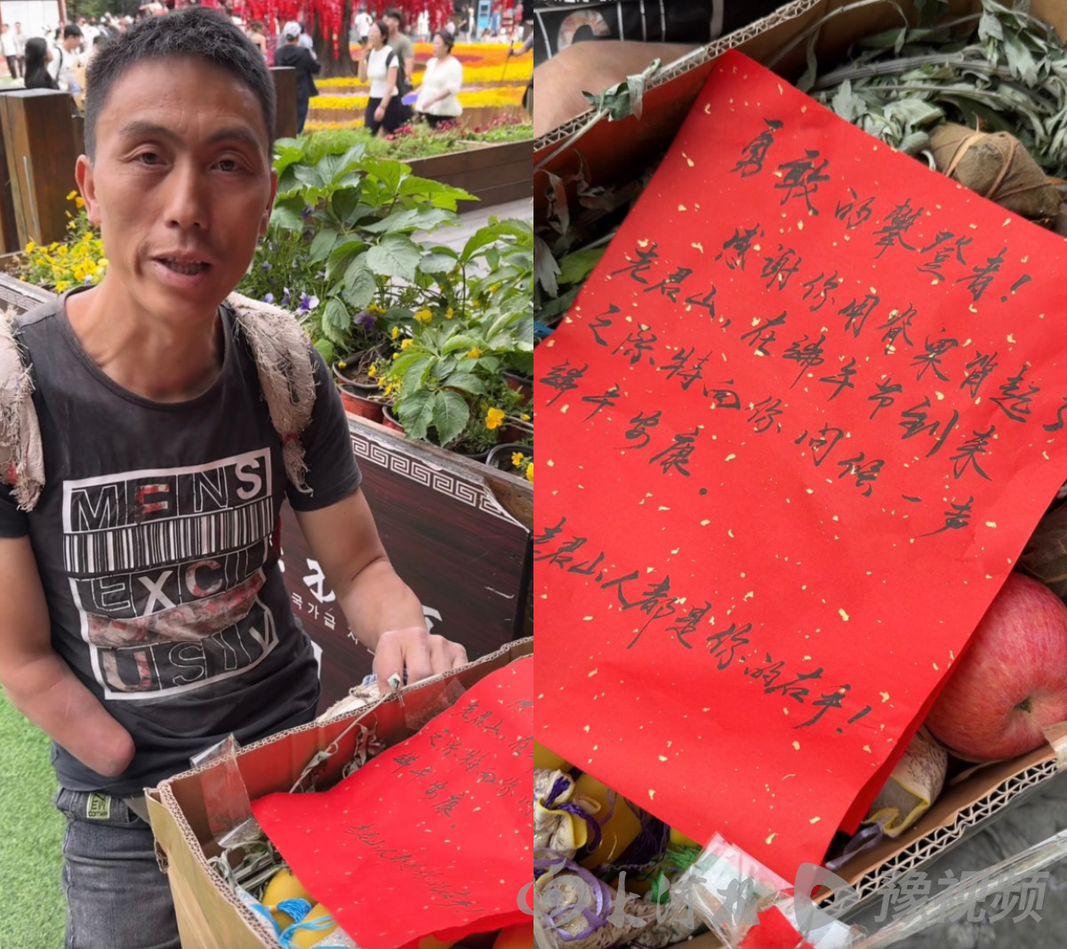 香囊、端午槲粽(槲包)、新鮮的蘋果和香蕉等水果,還有一張寫滿祝福的紅紙,靜靜地躺在箱底。紅紙上寫著:“勇敢的攀登者!感謝你用脊梁背起了老君山,在端午節(jié)到來(lái)之際特向你問(wèn)候一聲端午安康!——我們都是你的右手!”這份意外的禮物,讓平時(shí)總是為別人背負(fù)重物的楊文超感動(dòng)不已。