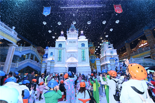 銀基冰雪世界冰湖飄雪秀吸引無數(shù)游客拍照