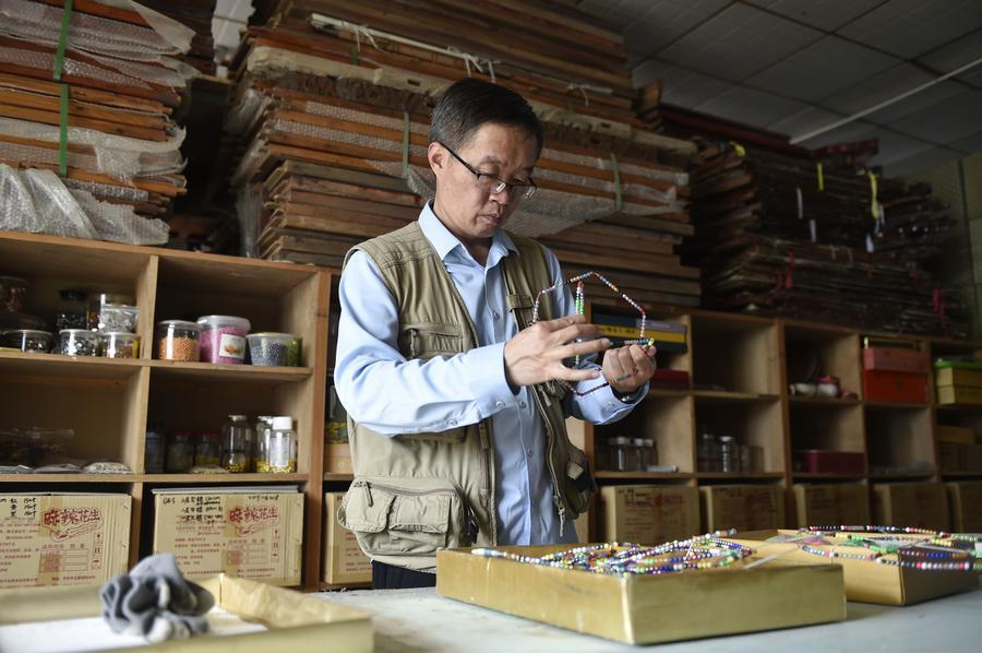 張俊濤在汴京燈籠張民間藝術博物館內整理燈籠(資料圖片)。新華社記者 盧燁 攝