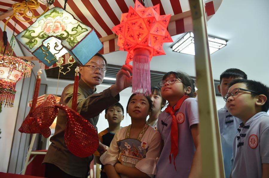 2023年6月8日,張俊濤(左一)在鄭州經濟技術開發(fā)區(qū)列子小學參加非遺進校園活動,向學生們介紹彩燈作品。新華社記者 魯鵬 攝