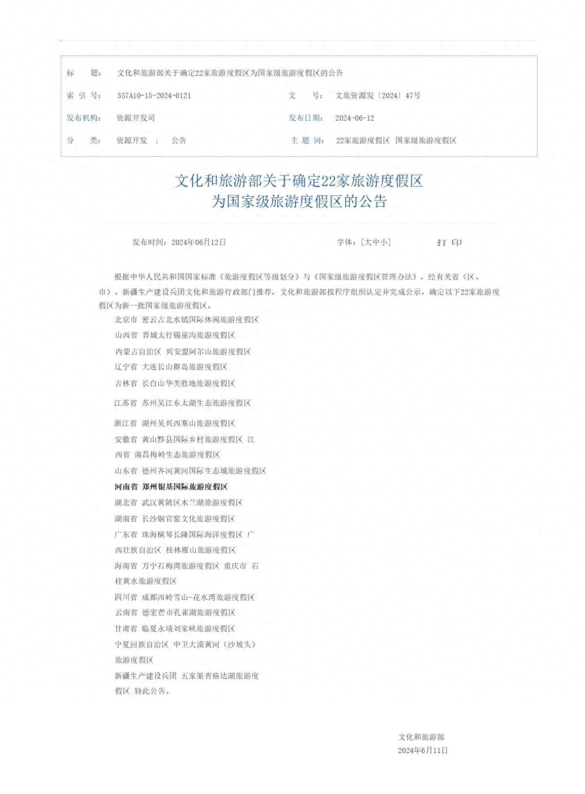 據(jù)國(guó)家文化和旅游部6月12日消息,根據(jù)中華人民共和國(guó)國(guó)家標(biāo)準(zhǔn)《旅游度假區(qū)等級(jí)劃分》與《國(guó)家級(jí)旅游度假區(qū)管理辦法》,經(jīng)有關(guān)部門推薦,文化和旅游部按程序組織認(rèn)定并完成公示,確定22家旅游度假區(qū)為新一批國(guó)家級(jí)旅游度假區(qū)。其中,鄭州銀基國(guó)際旅游度假區(qū)以其完善的度假設(shè)施、卓越的產(chǎn)品實(shí)力、優(yōu)質(zhì)的服務(wù)體驗(yàn)和市場(chǎng)品牌影響力成功入選,成為河南鄭州首個(gè)國(guó)家級(jí)旅游度假區(qū)。