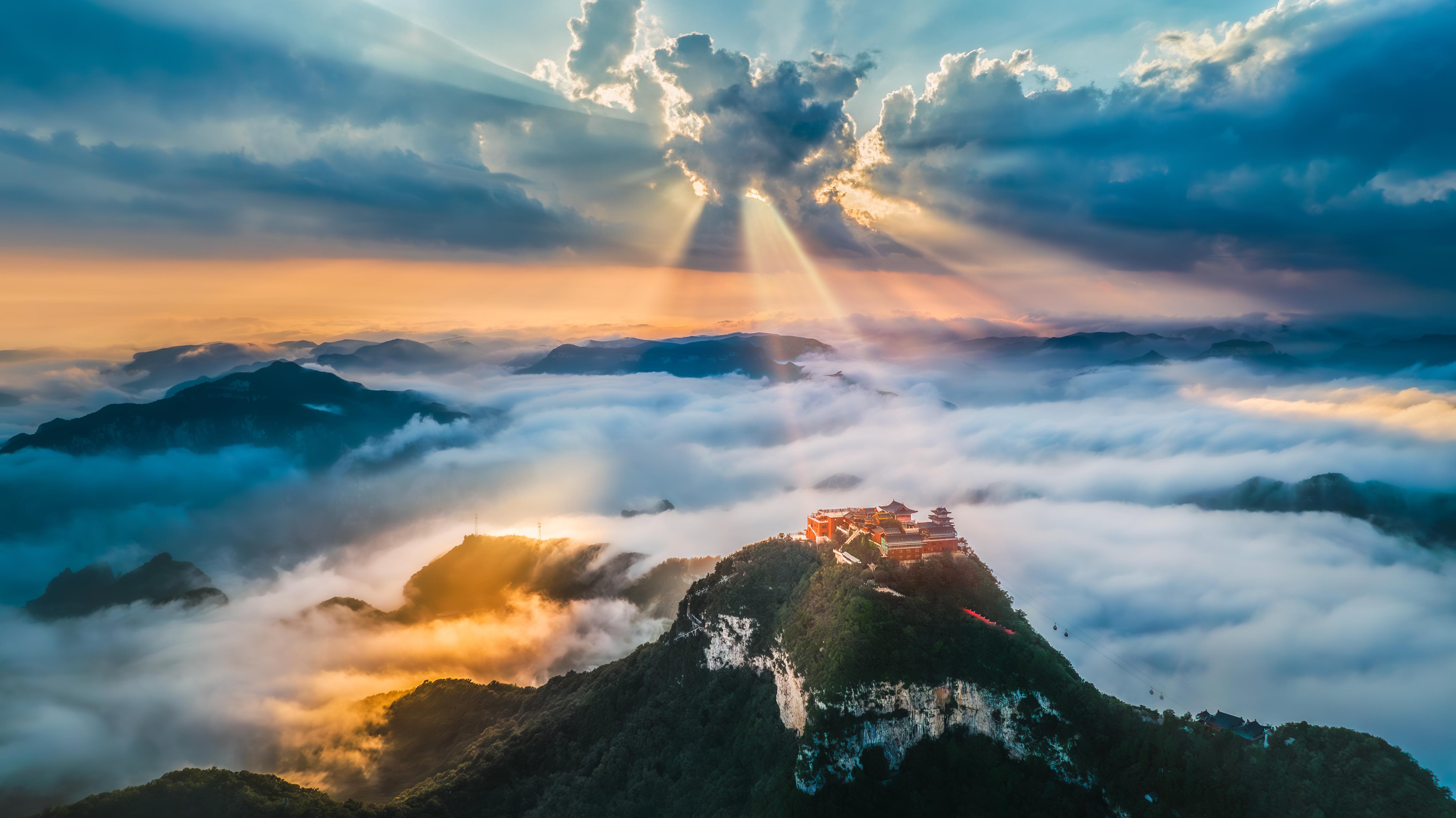 國(guó)家5A級(jí)旅游景區(qū)云臺(tái)山主峰茱萸峰云海翻涌,如夢(mèng)似幻