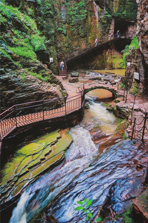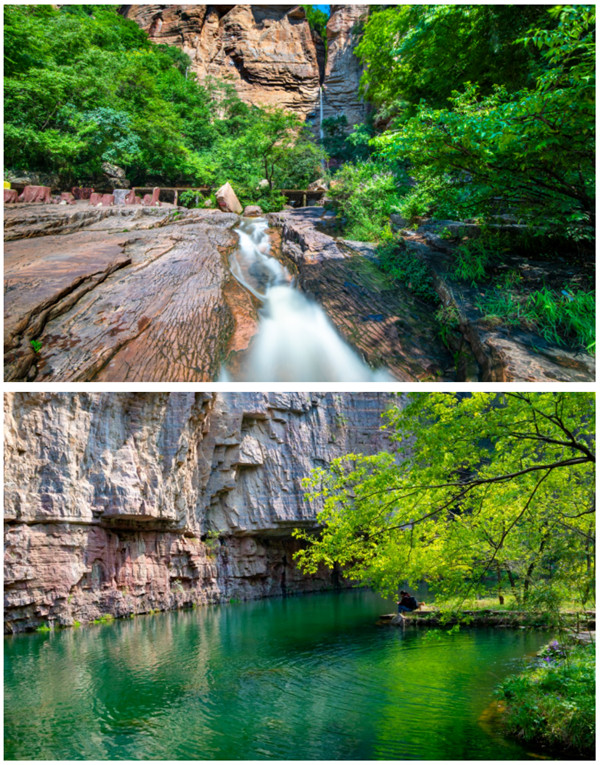百余米高的赤壁丹崖紅巖疊嶂,與生動鮮活的綠色植被交相輝映,溪水潺潺,鳥鳴啾啾,蟬鳴陣陣,愜意似仙境。