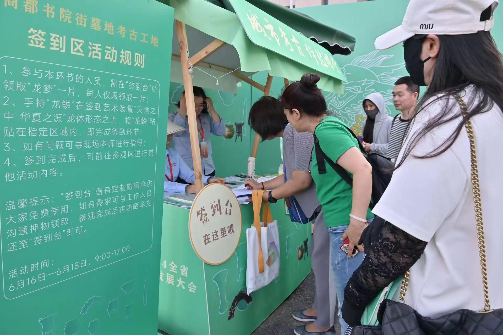 現(xiàn)場“簽到區(qū)”的造型墻以龍的圖騰形象為載體,游客在簽到處領(lǐng)取一片“龍鱗”,簽名后可以依次粘貼至龍?bào)w指定區(qū)域內(nèi),在完成簽到的同時(shí),復(fù)原“龍”的真實(shí)形態(tài),寓意“華夏兒女龍的傳人”。