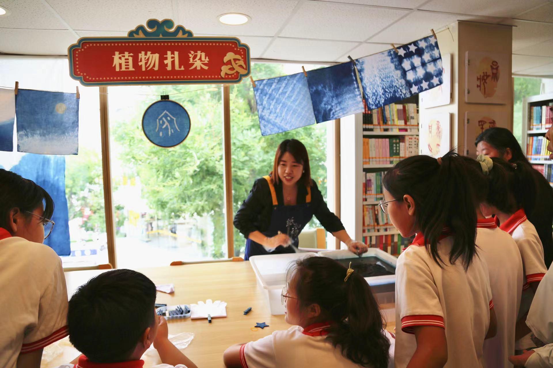 在書屋一角,一張張懸掛起來的植物扎染作品像是一幅幅流動的畫卷,將古老技藝與現(xiàn)代審美完美碰撞。“陳皮可以染出綠色,梔子染出黃色,板藍(lán)根染出藍(lán)色,通過巧妙的扎結(jié)和染色,能夠展現(xiàn)出豐富的色彩層次和細(xì)膩的紋理變化......”扎染老師講解著植物扎染的過程,孩子們聽得饒有興趣。