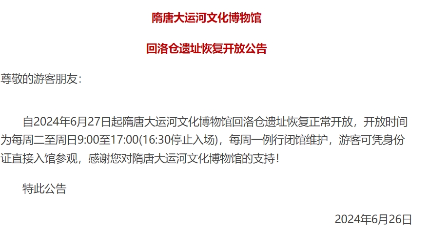 26日,隋唐大運(yùn)河文化博物館微信公眾號發(fā)布消息,27日起隋唐大運(yùn)河文化博物館回洛倉遺址恢復(fù)正常開放。