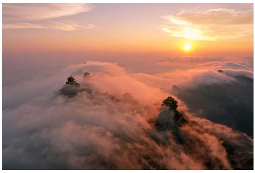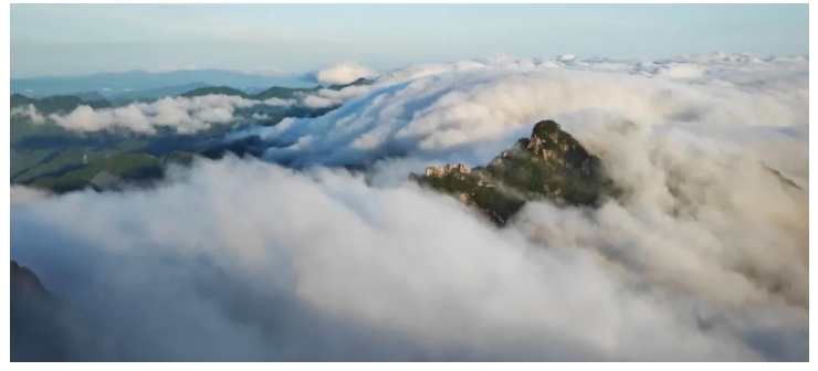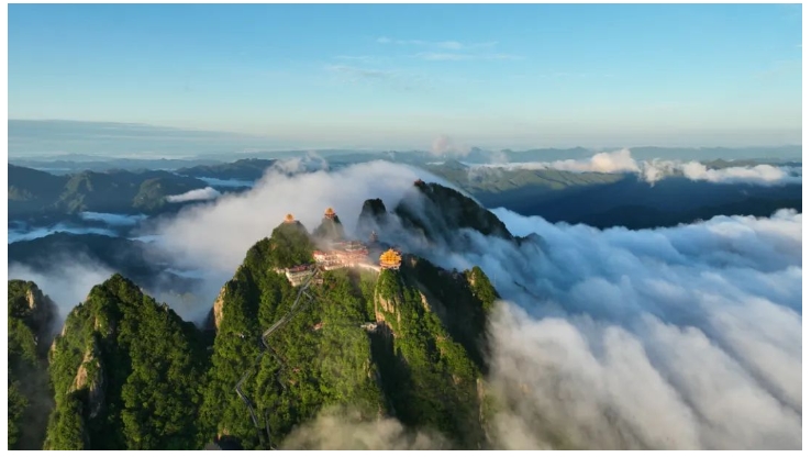 此時的老君山上,層巒疊嶂,云海翻涌,空氣濕度絕佳,氣候清涼宜人,是一年當中最好的云海觀賞期。波瀾壯闊的云海翻涌在群山峰林之間,與恢弘大氣的金頂交相輝映,宛若人間仙境。