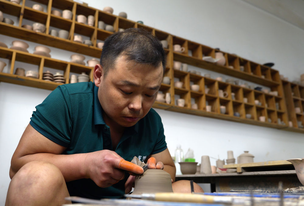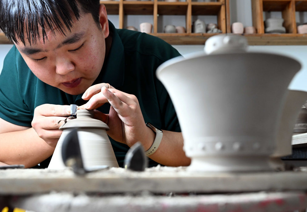 圖為工作人員在禹州市騶虞窯的工作室里進(jìn)行鈞瓷手工拉坯制作 李嘉南 攝