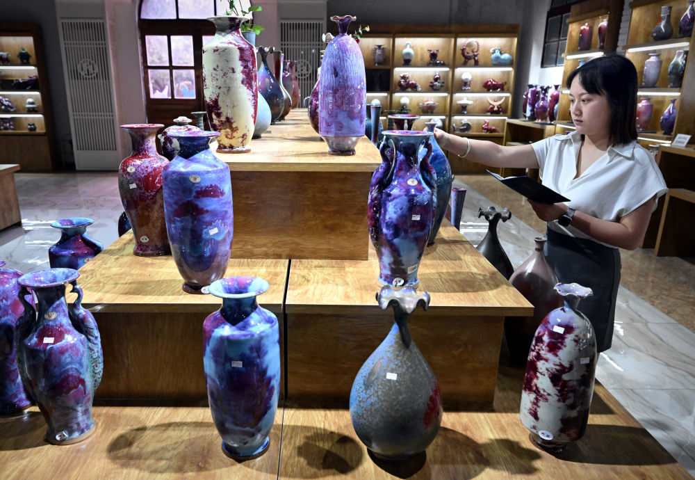 工作人員在禹州市孔家鈞窯的展廳里整理鈞瓷作品 李安 攝