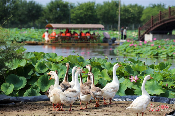 2024年7月6日,河南焦作,游客在武陟縣大虹橋鄉(xiāng)黃河龍澤園賞荷游玩。(牛書培攝/光明圖片)