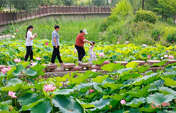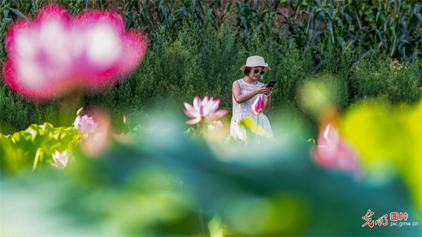 2024年7月9日,游人在山西省臨汾市襄汾縣堯京酒莊景區(qū)賞荷游玩。(李現(xiàn)俊攝/光明圖片)