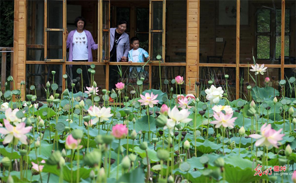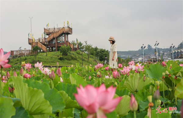 2024年7月7日,游客在重慶市南川區(qū)大觀鎮(zhèn)中江村荷花園賞花游玩。(瞿明斌攝/光明圖片)