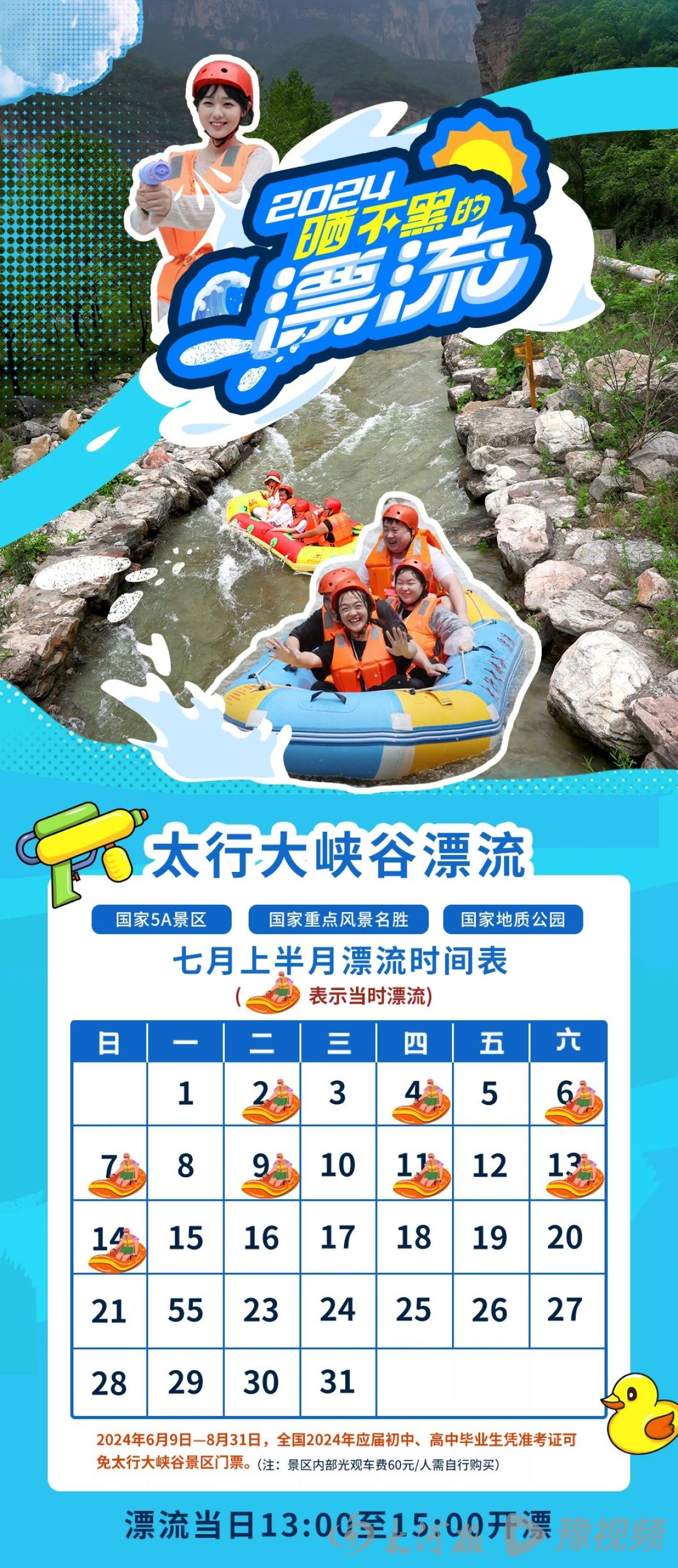 漂流時間安排:七月上旬,入場時間下午1:00——3:00,特殊天氣除外。