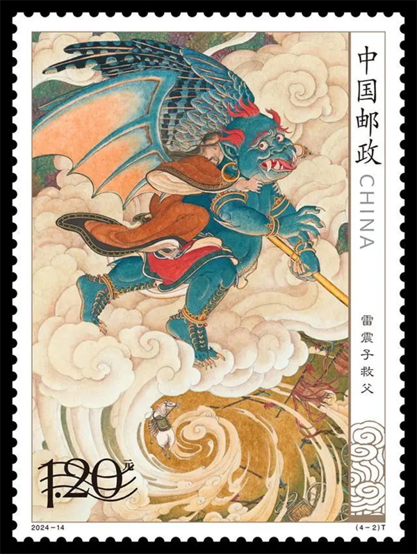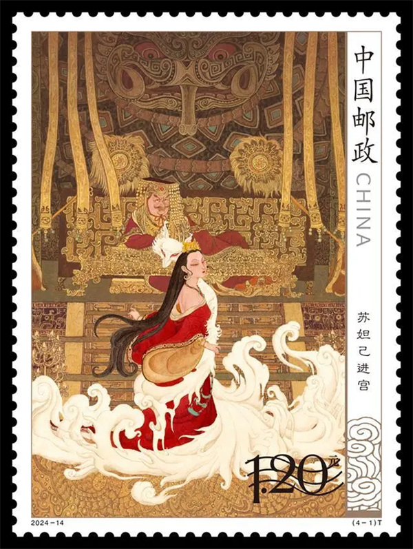 《封神演義(一)》特種郵票1套4枚,小型張1枚,全套郵票面值11.10元。郵票圖案名稱分別為“蘇妲己進(jìn)宮”“雷震子救父”“周文王訪賢”“武成王反商”,小型張圖案名稱為“哪吒鬧東海”。郵票采用中國(guó)傳統(tǒng)工筆重彩方式創(chuàng)作,畫面繼承宋畫美學(xué)意蘊(yùn),筆法精細(xì)、構(gòu)圖精密,充滿動(dòng)感和生命力,營(yíng)造出神秘古遠(yuǎn)、渾厚磅礴的史詩(shī)般的奇異化境。