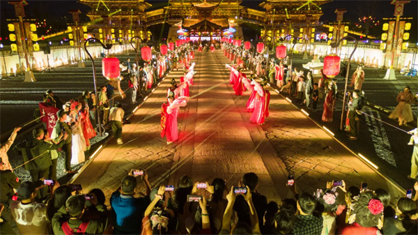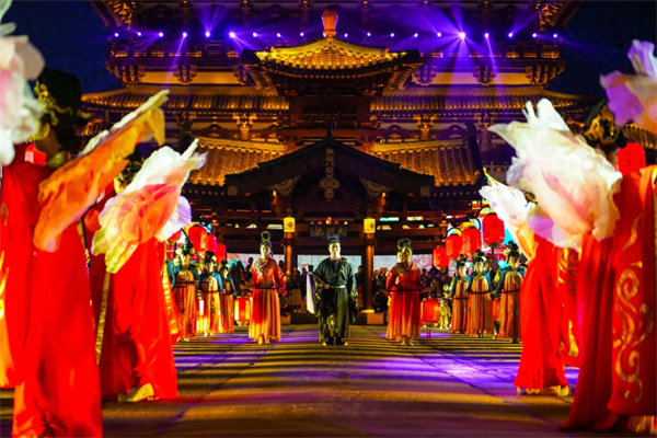 在瑤光殿前,御道迎賓,鼓舞激揚(yáng),讓人感受到大唐盛世的氣息;華服霓裳、皇家儀仗,精美絕倫的大唐服飾和華麗端莊的宮廷樂舞,更是呈現(xiàn)出一場穿越千年的浪漫與夢幻。一幕幕精彩的實(shí)景演出,讓游客在流光溢彩中漸入盛唐意境,一睹盛唐風(fēng)采。