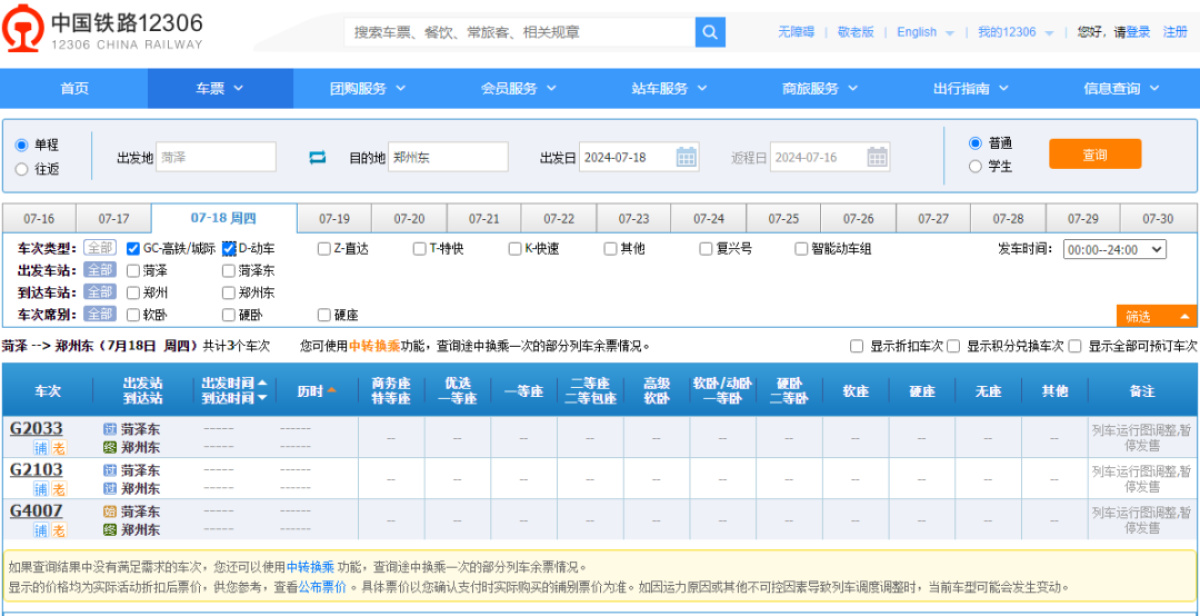 7月16日,中國鐵路12306網(wǎng)站顯示,7月18日開始,菏澤至鄭州之間,除普速列車之外,車次列表中又多出數(shù)趟G字頭高鐵列車。不過,車次“備注”欄均顯示“列車運(yùn)行圖調(diào)整,暫停發(fā)售”字樣。