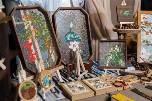 亭亭玉立的荷花、婀娜多姿的蘭花......用掐絲琺瑯制作而成,再鑲嵌在玻璃框中,花朵看起來精美又逼真,還有各種手串、以及用琺瑯工藝制作的畫作,為酷暑夏夜帶來一絲清涼。攤主是遼寧傳媒學院學生韓旭,她正在用掐絲琺瑯工藝制作一只青銅色的牛尊。“我在作品中融入了殷商文化元素,希望更多游客了解掐絲琺瑯傳統(tǒng)技藝和安陽的歷史文化。”韓旭說。