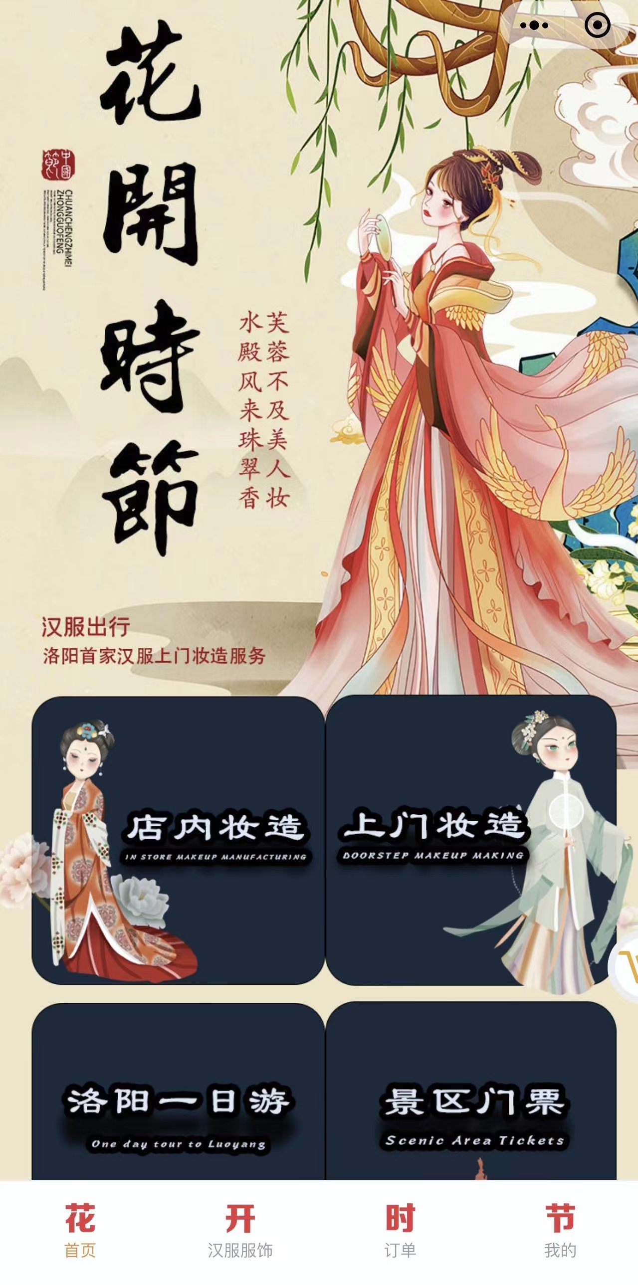 登錄“云裳洛城”漢服妝造平臺,游客可選擇“上門妝造”“店內(nèi)妝造”“洛陽一日游”“景區(qū)門票”等選項。