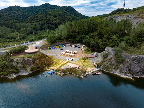 在碧波中潛游,于草坪上露營。環(huán)顧四周,遠(yuǎn)處是礦坑形成的獨(dú)特山石風(fēng)貌,近處是如同翡翠般的藍(lán)綠色水面,水中倒映著蒼郁林木的剪影與遠(yuǎn)山淡淡的輪廓,岸畔錯落著宛如點(diǎn)點(diǎn)繁星遺落凡間的露營帳篷。漫步于此,山谷間的風(fēng)即能撫平心中的憂愁。