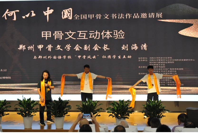 開幕式上,鄭州外國語學校“甲骨風云”社團組織了甲骨文互動體驗活動。鄭州大學教授、鄭州甲骨文學會副會長劉風華進行了“流動的殷墟卜辭字、詞、句”甲骨文知識講座。