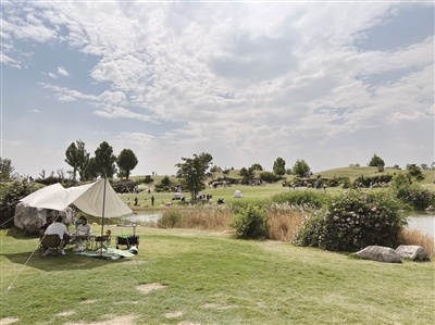 一頂頂色彩斑斕的帳篷,錯(cuò)落有致地分布在柔軟的草地上。游客們圍坐在烤爐旁,空氣中彌漫著肉香、海鮮香與調(diào)料香,引人垂涎。