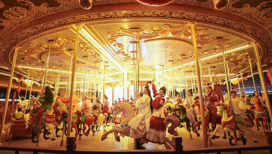 過山車【龍騰鼓舞】、旋轉(zhuǎn)木馬【骕骦千里】、海盜船【神舟出!、飛天轉(zhuǎn)盤【鳳舞九天】、逍遙花燈【花燈初上】,大宋·皇家樂園會(huì)因?yàn)槟銈兊牡絹砀雍猛妫?/p>