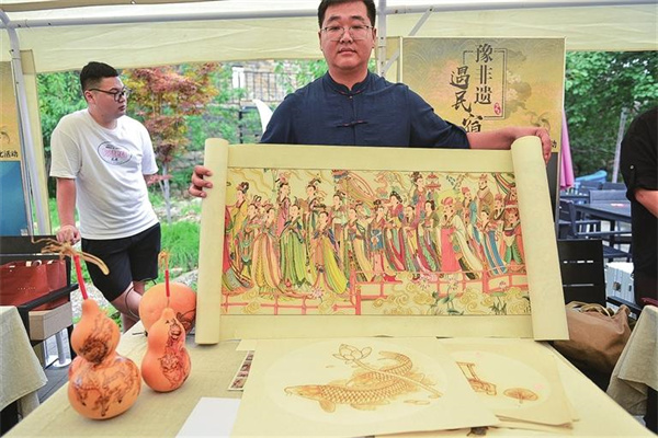 活動(dòng)現(xiàn)場(chǎng),絞胎瓷、民間剪紙、布藝香包、唐三彩、中藥材合香、宮廷杏仁茶、泥塑、烙畫(huà)、宋室風(fēng)箏、淮陽(yáng)布老虎、鄭氏麥芽芝麻糖等經(jīng)典非物質(zhì)文化遺產(chǎn)項(xiàng)目與游客見(jiàn)面。