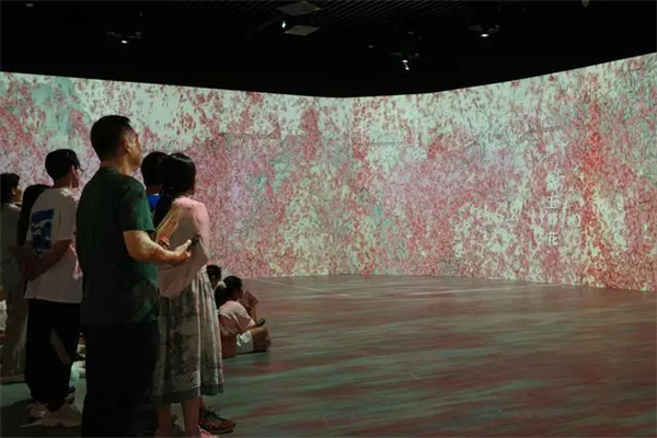 觀展中,可看到夢(mèng)幻的中式園林如畫卷般徐徐展開,大觀園中的玉砌雕闌、滿園芳菲、才子佳人……令人目不暇接,觀眾在數(shù)字光影展廳中沉溺于如夢(mèng)似幻的視聽盛宴。